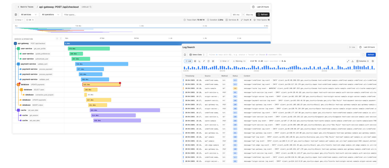 Jump from a log event to a full trace, or from a slow span straight to its logs. AI finds the problem, explains what happened, and recommends a fix.