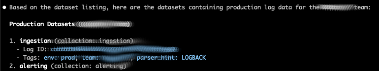 The tools get_datasets, get_keys, and get_values help users discover which datasets and fields are relevant for a particular query. This is especially useful for users unfamiliar with the structure or content of the logs. It also helps scope queries more effectively, for example, by excluding logs from staging environments when investigating production issues.