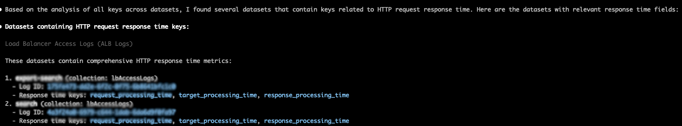 This example demonstrates the model’s ability to infer relevant fields based on general concepts such as “HTTP response time”, even when the exact field name is not provided. It also highlights a common challenge in observability: inconsistent naming of similar metrics across sources. While standards like OpenTelemetry Semantic Conventions exist, many systems have not adopted them yet. AI models really help overcome this issue.