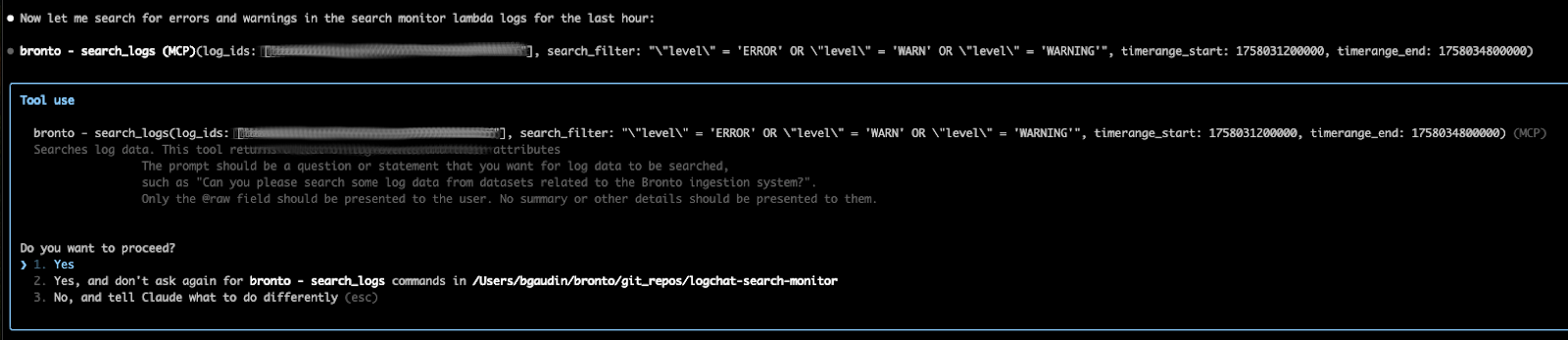 In this post I want to highlight two specific use cases. First we will show sample requests that the Bronto MCP server helps answer. Then we consider a scenario where Bronto’s MCP server is integrated with Claude Code, a popular code assistant. In this scenario we will get Claude Code to suggest code changes based on warnings observed in log data.