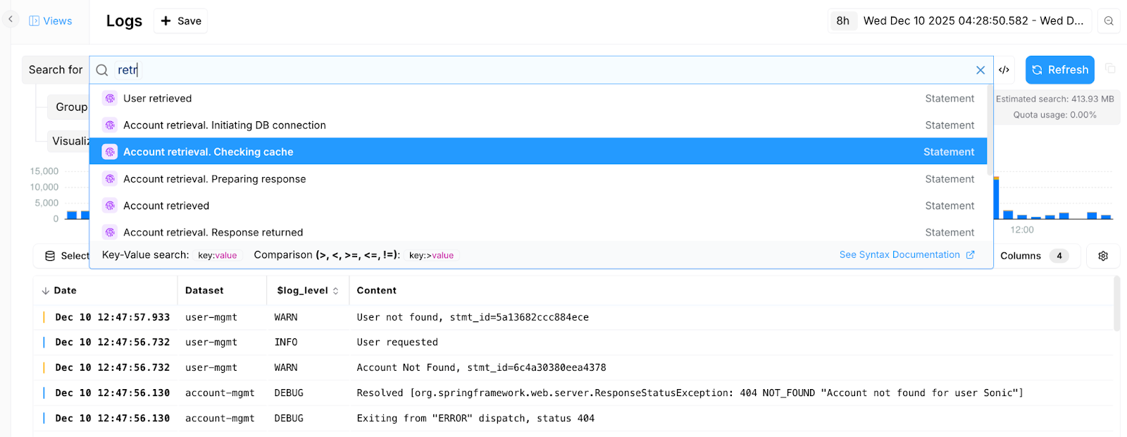 Bronto helps users refine their searches by suggesting log statements that match a given sequence of characters.