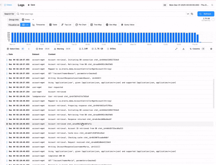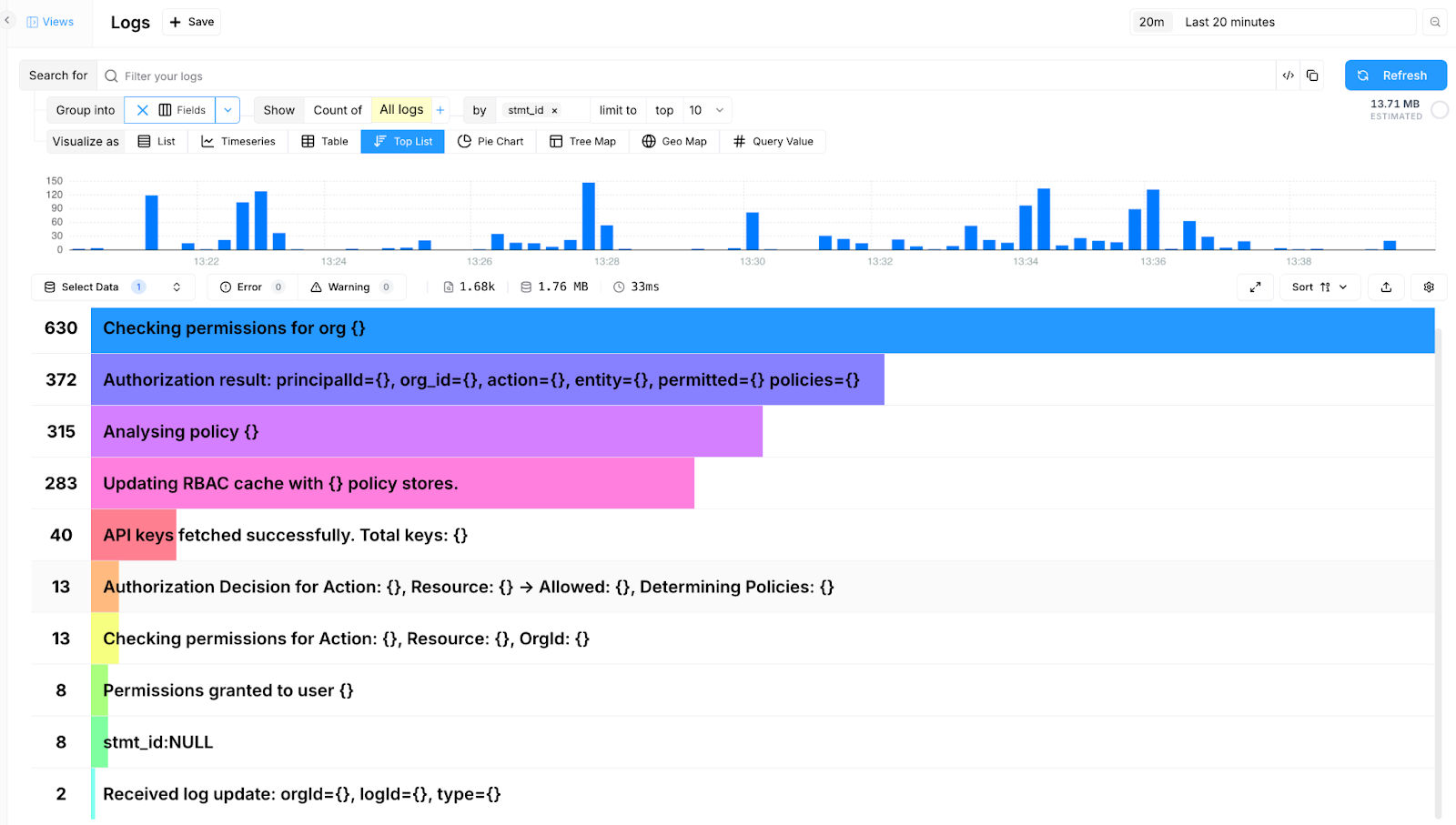 A third useful capability enabled by statement IDs is grouping log entries by their values. By counting entries per statement ID, you can quickly identify which log statements appear most frequently in your dataset. This provides a good approximation of which statements contribute the most to your ingestion volume, often closely linked to your overall logging costs. Note, however, that this is only an approximation as it indicates a number of log entries rather than an amount of data ingested. Many solutions, like Bronto, rely on the latter for billing.